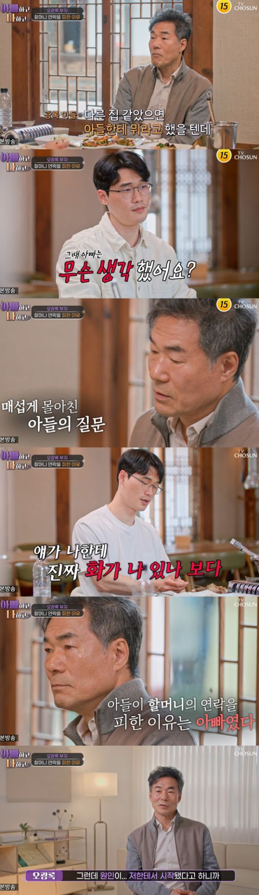 "아들이 할머니 연락을 피한 이유를 알고 있었냐"는 제작진의 질문에 오광록은 "아니다. (저 때문이라고) 콕 집어서 생각하진 않았다. 제 전화는 안 받는다고 쳐도 '할머니한테 그럴 건 없잖아' 생각했다. 그런데 원인이 저한테서 시작됐다고 한다"라고 답했다.