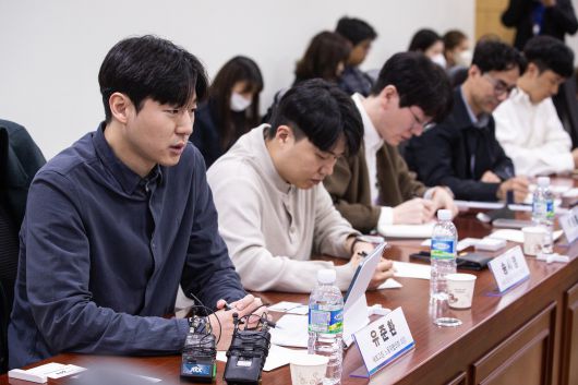 유준환 새로고침 노동자협의회 의장이 2023년 3월 국회에서 국회 환노위 더불어민주당 의원들과 간담회를 하고 있다./뉴스1 |