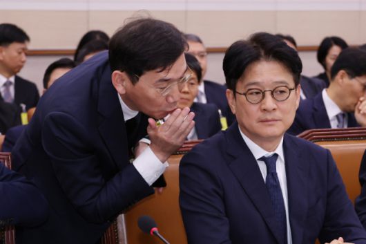 ▲이창수 서울중앙지검장이 2024년 10월 18일 오전 국회 법제사법위원회의 서울고검, 수원고검, 서울중앙지검 등에 대한 국정감사에서 조상원 서울중앙지검 4차장 검사의 귓속말을 듣고 있다. ⓒ연합뉴스 |