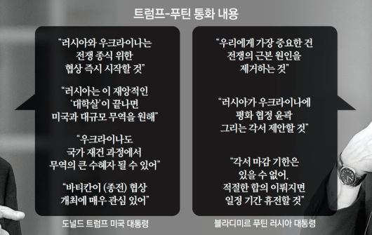 도널드 트럼프 미국 대통령은 19일(현지 시간) 블라디미르 푸틴 러시아 대통령과 2시간 동안 통화한 뒤 “러시아와 우크라이나가 전쟁 종식을 향한 협상을 즉시 시작할 것”이라고 밝혔다. 하지만 같은 날 푸틴 대통령은 통화 직후 성명에서 협상 시기에 대한 언급 없이 “우리에게 가장 중요한 것은 이 위기(전쟁)의 근본 원인을 제거하는 것”이라며 기존 주장을 되풀이했다. 푸틴 대통령이 트럼프 대통령의 ‘즉시 협상’ 제안을 사실상 거부한 것으로 풀이된다. 또 두 정상이 ‘알맹이 없는 통화’를 했다는 지적이 제기된다.
