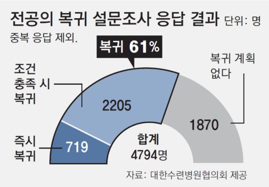 20일 대한수련병원협의회에 따르면 이달 8∼12일 사직 전공의 대상 설문조사에서 응답자 4794명 중 약 61%인 2924명이 복귀 의사를 밝혔다. 이 가운데 특정 조건이 수용되면 복귀하겠다고 답한 전공의는 2205명(46%)이었다. 즉시 복귀 의향을 밝힌 전공의는 719명(15%)이었다. 1870명(39%)은 복귀 계획이 없다고 응답했다. 전공의들이 내건 복귀 조건은 5월 복귀 시 정상 수련으로 인정, 입대한 사직 전공의 제대 후 복귀 보장, 필수 의료 정책 패키지 재논의 등이다.