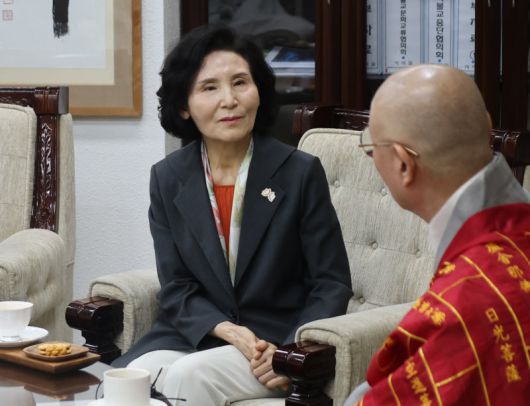 국민의힘 김문수 후보의 배우자 설난영 씨가 20일 서울 종로구 한국불교태고종 법륜사에서 상진 총무원장 스님을 예방하는 모습. 국민의힘 제공 |