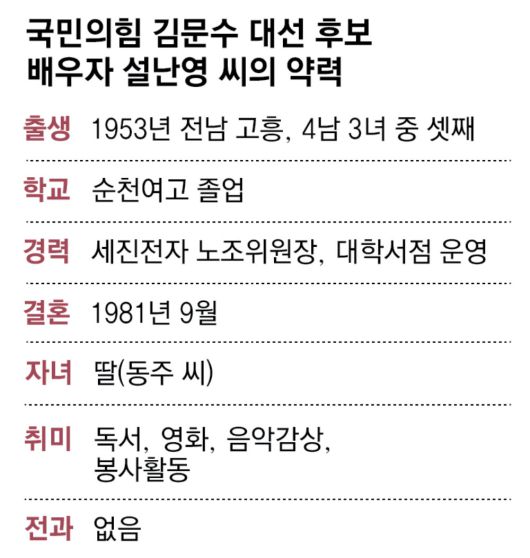 설 씨는 김 후보의 이번 대선 출마에 반대했다고 한다. 김 후보가 국회 본회의장에서 더불어민주당 서영교 의원의 사과 요구를 거부한 뒤 대선 후보로 주목받은 데 대해 “일시적인 반응”이라고 생각했다는 것. 그러다가 두어 달 동안 김 후보에 대한 지지가 계속되니 “이 시대가 소망하는 인물이 김 후보인가”라고 생각하며 출마에 동의했다고 한다. 설 씨는 “김 후보도 처음엔 주저했는데 조심스럽게 (출마 필요성을) 받아들였다”고 전했다.