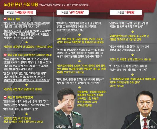 퇴임 이후 행보와 관련해서 노 전 사령관은 문건에서 “국민과 소통하면서 자연스럽게 현 시국 상황에 대한 우려와 인식을 공유하여 지도자급으로서의 이미지를 노출”시키고 “재래시장, 청계천, 남대문, 지하철 등에서 몰래카메라의 형식으로 소박하고 인간적인 냄새를 국민이 느낄 수 있도록 깜짝 행보”를 해야 한다는 의견을 담았다. 또 “현 정치체제와 일정 기간 거리두기를 하다가 내년 9월을 목표로 국민의힘에서 모셔가는 형식으로 영입”, “AN(안철수 추정) 등 여타의 후보군을 모두 참여시켜서 경선을 하고 여타의 후보군이 꼼짝없이 경선에 참여하지 않으면 안 되게 사전에 정리작업” 등의 내용도 포함됐다. 실제로 윤 전 대통령은 검찰총장 사퇴 4개월 뒤인 2021년 7월 국민의힘의 영입 제안을 받고 입당했다.