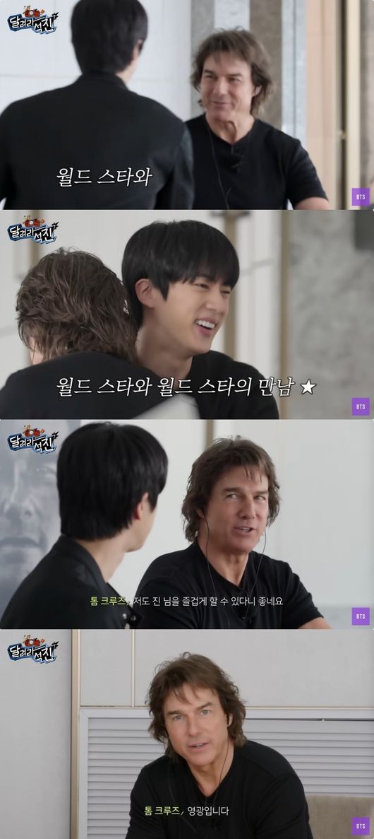 진은 “BTS 멤버들아 톰 크루즈님이 우리 아신대”라고 영상편지를 남기며 밝게 웃었다. 톰 크루즈는 그런 진을 웃으며 바라봤다.
