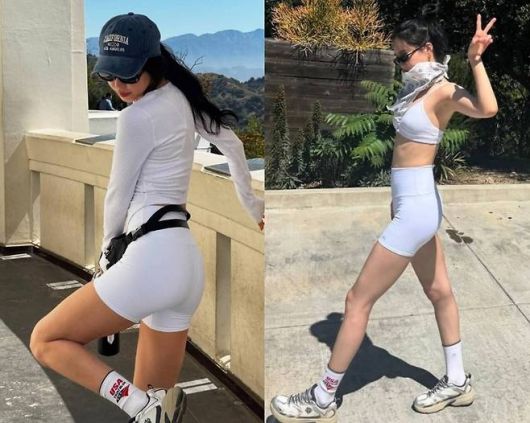 잘록한 허리선과 매끈한 하체 라인이 그대로 드러나는 핏은 ‘운동이 곧 스타일’임을 증명했고, 뉴트럴 컬러의 스니커즈와 ‘USA’ 양말, 웨이스트백으로 마무리한 디테일은 힙한 분위기를 배가시켰다.