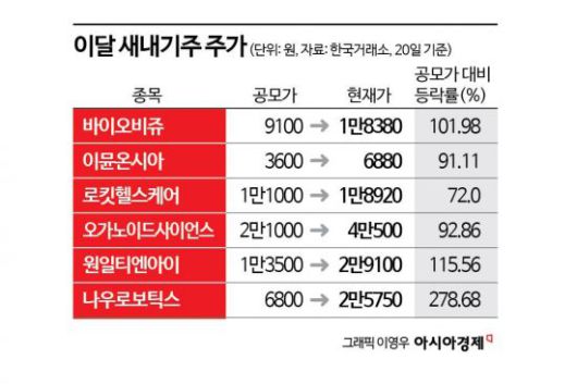 바이오비쥬 외에 이달 상장한 새내기주들 모두 공모가를 크게 웃돌고 있다. 지난 8일 코스닥시장에 상장한 나우로보틱스는 공모가 대비 278.68% 상승한 상태다. 공모가 6800원이었던 나우로보틱스는 현재 2만5750원이다. 원일티엔아이는 115.56% 올랐고 오가노이드사이언스는 92.86%, 이뮨온시아는 91.11%, 로킷헬스케어는 72% 각각 상승했다.