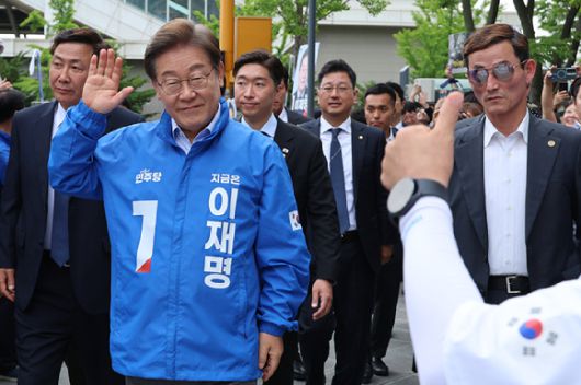 더불어민주당 이재명 대선 후보가 20일 경기 파주시 금릉역 중앙광장에서 열린 유세에서 시민들에게 인사하고 있다. 2025.5.20 [사진=연합뉴스] |