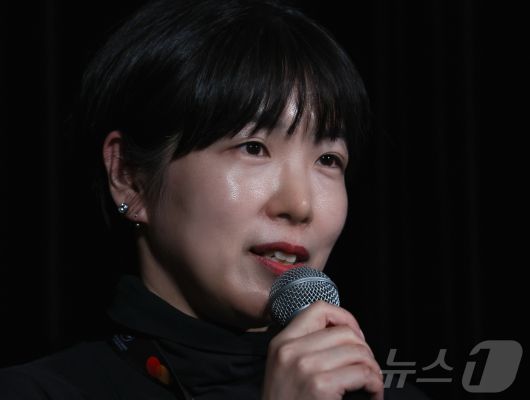 (파리=뉴스1) 이준성 기자 = 제78회 칸 국제영화제가 열리고 있는 프랑스 남부 소도시 칸(Cannes)의 에스파스 미라마르(Espace Miramar) 극장에서 비공식 부문인 비평가주간 단편 경쟁 부문 갈라 상영회가 열려, 애니메이션 ‘안경’의 정유미 감독이 무대 인사를 하고 있다. 2025.5.21/뉴스1