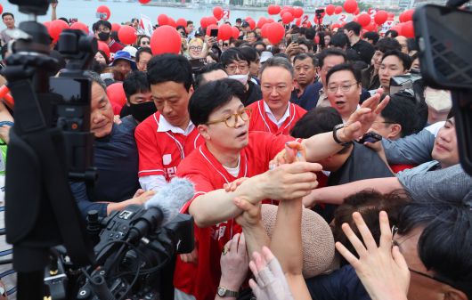 한동훈 전 국민의힘 대표가 20일 오후 부산 수영구 광안리해수욕장을 찾아 취재진 질문에 답하고 있다. 한 전 대표는 공식선거운동 이후 이날 첫 현장유세에 나섰다. <연합뉴스> |