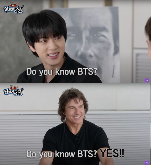 진은 첫 질문으로 “방탄소년단 알아요? (Do you know BTS?)”라고 재치있게 물었고, 톰 크루즈는 망설임없이 “YES”라며 환한 웃음으로 화답했다. 이어 “우리 모두 BTS를 안다”고 재차 강조하자, 진은 “멤버들아, 톰 크루즈님이 우리를 안대!”라며 감격을 감추지 못했다.
