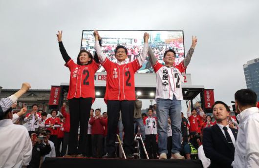 나경원 국민의힘 의원(왼쪽)과 김문수 대선 국민의힘 후보가 지난 19일 서울역 광장 유세에서 시민들에게 지지를 호소하고 있다. [사진=연합뉴스] |