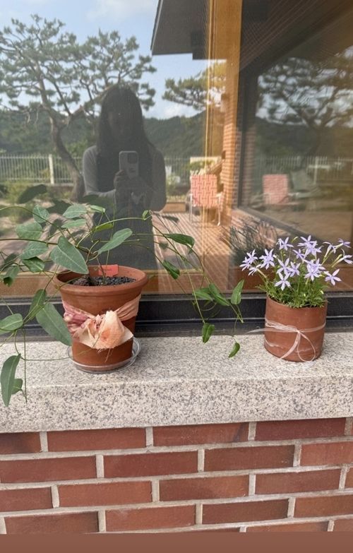 첫 번째 사진에는 화분 두 개가 창틀에 놓여 있고, 유리창 너머로 반려식물을 바라보는 이효리의 실루엣이 반사돼 담겼다.