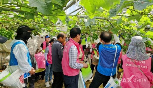 농협 대전지역본부는 고향주부모임대전시지회 행복나눔봉사단과 함께 21일 본격적인 영농철을 맞아 대전 동구 삼괴동의 포도농가를 찾아 농촌 일손 부족 해소에 적극 나섰다. [사진제공=농협 대전지역본부][대전=팍스경제TV] 농협 대전지역본부(이하 대전농협)는 (사)고향주부모임대전시지회 행복나눔봉사단과 함께 오늘(21일) 본격적인 영농철을 맞아 대전 동구 삼괴동의 포도농가를 찾아 농촌 일손 부족 해소에 적극 나섰습니다.