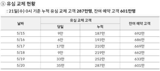 21일 SK텔레콤 뉴스룸에 따르면 전날(20일) 하루 동안 유심교체를 진행한 가입자는 35만명으로 집계됐다. 이로써 누적 유심교체 가입자는 총 287명이다. 온라인 유심 교체 대기자는 601만명으로 전날 대비 약 32만명 줄었다.
