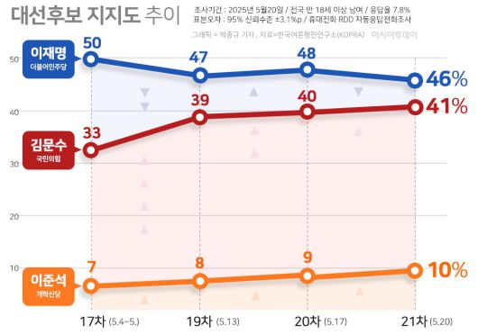 이번 조사는 아시아투데이가 의뢰해 한국여론평판연구소(KOPRA)가 지난 20일 하루 동안 전국 만 18세 이상 남녀 1003명을 대상으로 한 여론조사 결과로, 이재명 후보 46%, 김문수 후보 41%, 이준석 후보 10%의 지지율을 보였다. 이어 권영국 민주노동당 대선후보 1%, 황교안 무소속 대선후보 1%, 송진호 무소속 대선후보 0%, 없음 1%, 잘모름 1% 지지율 순을 나타냈다.