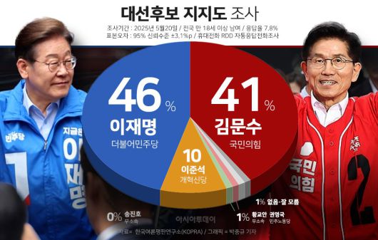 아시아투데이 한대의 기자 = 21일 대선후보 지지도 조사에서 이재명 더불어민주당 후보 46%, 김문수 국민의힘 대선후보 41%, 이준석 개혁신당 대선후보는 10%의 지지율을 나타냈다. 양강 구도 속 이재명·김문수 후보의 지지율 격차는 오차범위 내 5%포인트(p)로, 접전 양상을 보이고 있다. 특히 보수 지지층(김문수 후보 72%)보다 진보 지지층(이재명 후보 80%)의 결집이 더 강한 것으로 나타났다.