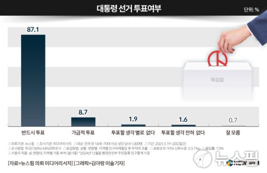 [서울=뉴스핌] 박찬제 기자 = 6·3 대통령 선거에서 투표하겠다고 응답한 유권자가 95.8%에 달한다는 여론조사 결과가 21일 나왔다.