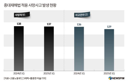1분기 중대재해 사고건수는 129건으로, 전년 동기 대비 사망자 수와 사고건수는 각각 1명(0.7%), 7건(5.1%) 감소했다.