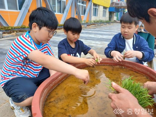 충남 보령한내초등학교 1~ 2학년 학생들은 20일 본동 건물 앞 고무대야에 모내기를 하며 자연과 전통 농경문화의 소중함을 체험했다.