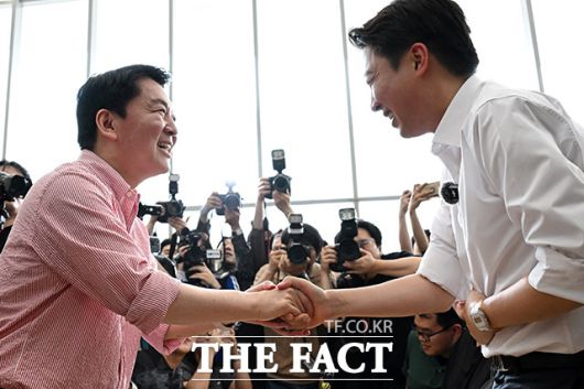이준석 개혁신당 대선 후보(왼쪽)와 안철수 국민의힘 의원이 21일 오전 경기도 성남시 가천대학교에서 간담회 전 인사를 나누고 있다. /성남=남용희 기자 |