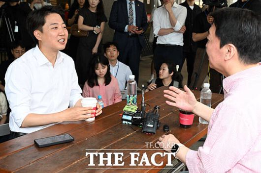 [더팩트ㅣ성남=남용희 기자] 이준석 개혁신당 대선 후보(왼쪽)와 안철수 국민의힘 의원이 21일 오전 경기도 성남시 가천대학교에서 간담회를 갖고 대화를 나누고 있다.