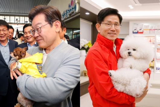 이재명 더불어민주당 대선 후보(왼쪽)가 지난 11일 전남 강진군 강진오감통시장에서, 김문수 국민의힘 대선 후보가 지난 13일 대구의 한 동물병원에서 강아지를 안아보고 있다. 연합뉴스·김문수 캠프 제공 |