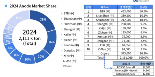 한국과 일본의 음극재 업체들은 지난해 중국 업체들의 과잉 생산과 저가 수주 경쟁에 밀려 고전했다. 포스코퓨처엠의 경우 2020년 6위에서 2021년 8위, 2022년과 2023년 10위로 밀려난 뒤 지난해에는 11위(2만 7200톤)에 그쳤다. 2024년 전기차 캐즘으로 인한 수요 둔화 및 미국 정부의 중국산 흑연 음극재 공급 유예로 타격을 받았다. 또 중국산 흑연 제품과의 가격경쟁에도 밀리렸다.