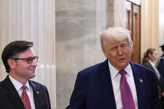 20일(현지시간) 연방 의사당을 찾은 도널드 트럼프 미국 대통령(오른쪽)과 마이크 존슨 하원의장(공화·루이지애나).(사진=AFP) |