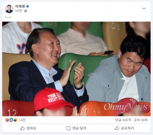 21일 오후 이재명 더불어민주당 대선 후보가 자신의 SNS(소셜미디어)에 게재한 윤석열 전 대통령의 다큐멘터리 영화 관람 관련 반응 게시물. /사진=이재명 후보 SNS 갈무리 |