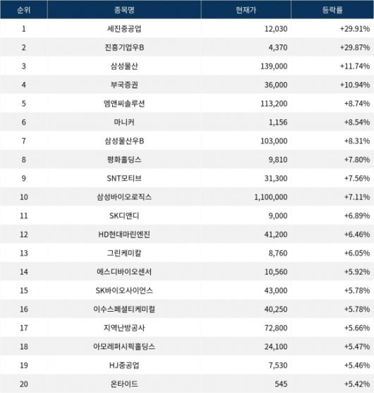 6위 마니커(027740)는 종가 1,156원으로 8.54% 상승 마감했다. 7위 삼성물산우B(02826K)는 종가 103,000원으로 8.31% 상승 마감했다. 8위 평화홀딩스(010770)는 종가 9,810원으로 7.80% 상승 마감했다. 9위 SNT모티브(064960)는 종가 31,300원으로 7.56% 상승 마감했다. 10위 삼성바이오로직스(207940)는 종가 1,100,000원으로 7.11% 상승 마감했다.