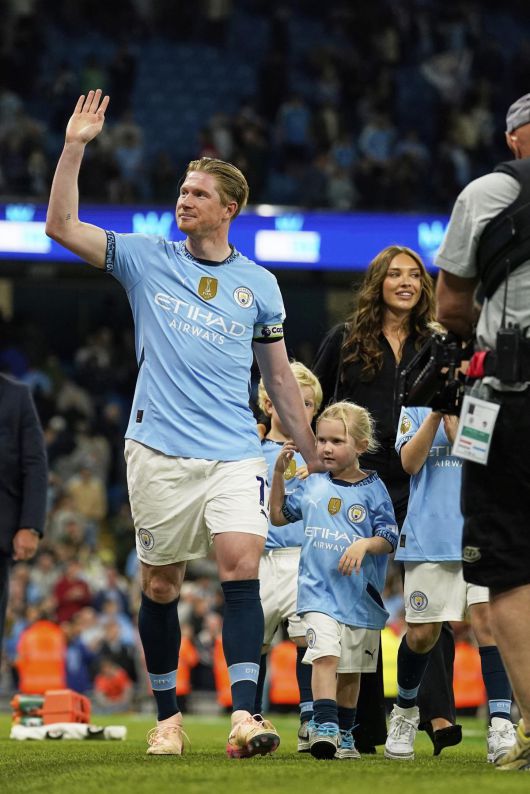 올 시즌을 끝으로 10년간 몸담았던 잉글랜드 프리미어리그(EPL) 맨체스터시티를 떠나는 케빈 더브라위너(왼쪽)가 가족들과 함께 맨시티 안방 구장인 에티하드 스타디움에서 팬들에게 인사를 하고 있다. 맨체스터=AP 뉴시스 |