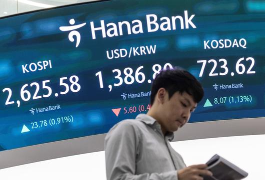 21일 서울 중구 하나은행 딜링룸 화면에 이날 거래를 마감한 코스피와 코스닥지수, 원·달러 거래가가 표시돼 있다. /연합뉴스 |
