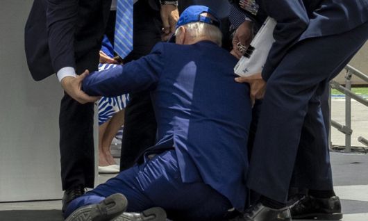 2023년 6월 당시 80세이던 조 바이든 미국 대통령이 공군사관학교 졸업식장에서 모래주머니에 발이 걸려 넘어진 직후 경호원들의 부축을 받고 있다. 이를 두고 미국인들 사이에 바이든의 ‘고령 리스크’를 우려하는 목소리가 커졌다. AP연합뉴스 |