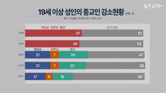 우리나라에서 종교를 가진 인구는 갈수록 줄고 있다. 한국갤럽의 설문조사 결과, 만 19세 이상 성인 가운데 불교와 개신교, 천주교를 믿는 인구 비율은 2004년 52%에서 2021년에는 39%로 감소했다. 개신교인은 21%에서 17%로, 천주교인은 7%에서 6%로, 불교를 믿는 인구 비율은 24%에서 16%로 줄었다.