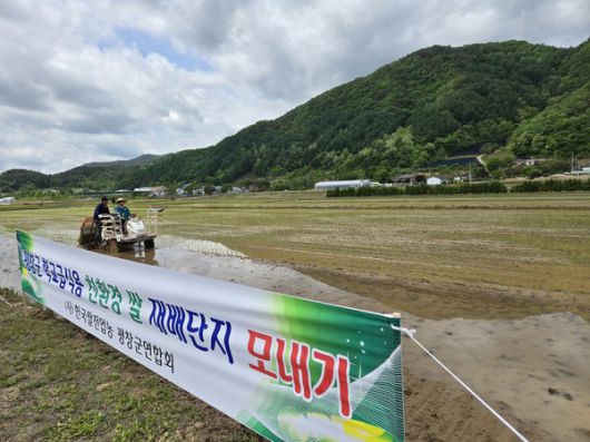 (평창=국제뉴스) 서융은 기자 = 쌀전업농평창군연합회는 21일 평창읍 후평리 611번지 일대 친환경 벼 과제포에서 학교 급식용 친환경 쌀 재배를 위한 벼 모내기 행사를 개최했다.