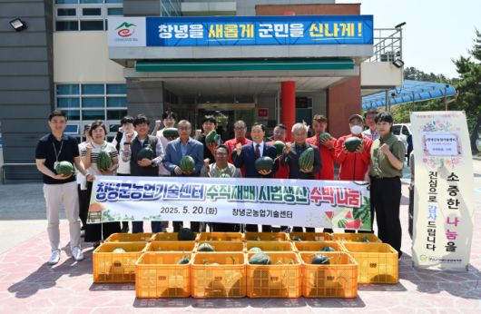 성낙인 경남 창녕군수가 지난 20일 농업기술센터 실증시범포에서 생산한 수박을 선보이고 있다. [사진=창녕군] 2025.05.21 |