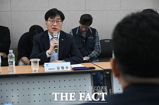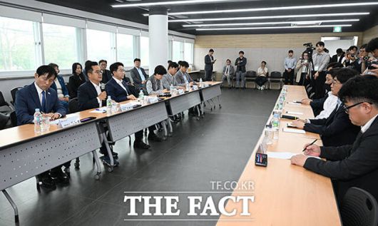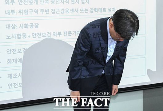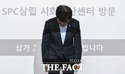 [더팩트|시흥=박헌우 기자] 김범수 SPC삼립 대표이사가 21일 오후 경기 시흥시 SPC삼립 시화공장에서 더불어민주당 중앙선대위 잘사니즘위원회·을지로위원회와 간담회에 앞서 이번 사고에 대해 고개 숙여 사과하고 있다.