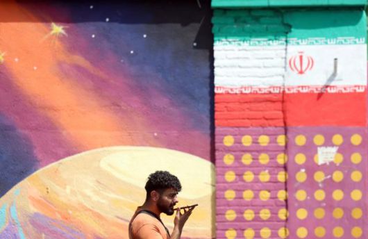 한 이란 남성이 지난 5일 이란 테헤란에서 이란 국기가 그려진 벽화 앞을 지나가고 있다. 테헤란=EPA 연합뉴스 |