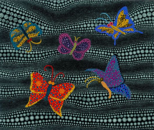 점의 반복적인 배열이 물결을 이루고 그 위로 나비 다섯 마리가 자유롭게 날아다니고 있다. 깊은 시각적 몰입을 선사하는 이 작품은 생명과 자유, 무한성을 탐구하는 구사마 야요이의 2004년 작 'Butterflies "TWAO"'. 이른바 '땡땡이 호박'으로 유명한 구사마 야요이의 '땡땡이 나비'다.