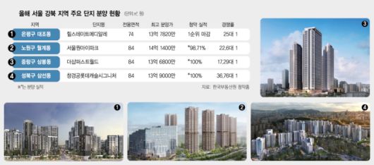 앞서 최초 청약에서 미분양 물량이 나왔던 서울 강북 지역 단지들도 속속 계약이 100% 완료되고 있다. 포스코이앤씨가 시공해 지난해 12월 분양했던 서울 중랑구 상봉동 ‘더샵퍼스트월드’는 이달 초 모든 공급 물량이 계약됐다. 더샵퍼스트월드도 전용 84㎡ 분양가가 평균 13억 5000만 원으로 3.3㎡당 3800만 원을 넘기며 고분양가 논란이 일었던 단지다.