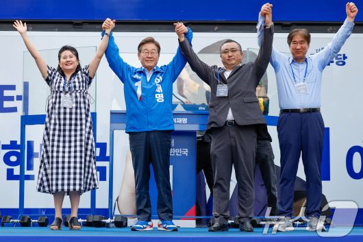 (인천=뉴스1) 안은나 기자 = 이재명 더불어민주당 대통령 후보가 사흘째 수도권 표심잡기에 나선 21일 오후 인천 서구 롯데마트 청라점 앞을 찾아 지지를 호소하고 있다. 왼쪽부터 정소혜씨, 이 후보, 김진경씨, 방현석 소설가. 2025.5.21/뉴스1