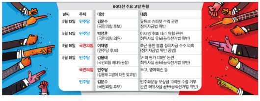 6·3 대선 레이스가 종반전에 접어들면서 더불어민주당과 국민의힘 간 네거티브 경쟁이 점입가경으로 흐르고 있다. 이번 선거는 주요 정당 대선 후보를 선출한 이후 불과 한 달여 만에 치러지면서 사실상 공약이나 정책 대결이 실종된 상태다. 오직 진영 간 결집만 강조되면서 신경전이 격화될 수밖에 없는 구조라는 얘기다. 결국 서로를 향한 고발이 난무하는 등 진흙탕 싸움으로 번지는 모습이다.