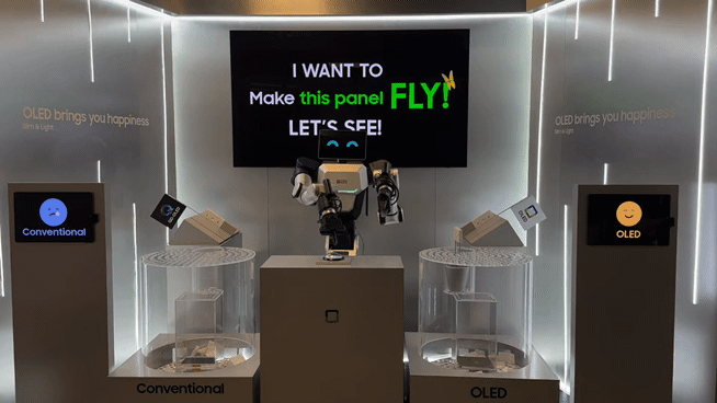 "OLED(유기발광다이오드) 패널만 날아요."21일 대만 타이베이 난강 전시센터에서 열리는 '컴퓨텍스 2025'에 참가한 삼성디스플레이 전시관에 들어서자 가장 먼저 로봇이 반겨준다. 삼성전자가 투자한 레인보우로보틱스의 이동형 양팔로봇이 바람에 날리는 OLED를 직관적으로 보여주며 LCD보다 가볍다는 것을 알려준다.