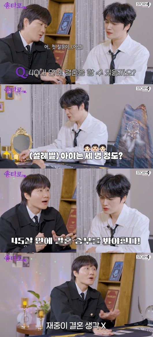 이어 김재중은 타로 질문으로 "40대 안에 결혼을 할 수 있을지"에 대해 물었다. "형제가 많아 아기도 많이 갖고 싶을 것 같다"는 이용진의 말에 김재중은 "아이는 한 세 명 정도?"라고 답했다.