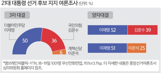 YTN이 여론조사기관 엠브레인퍼블릭에 의뢰해 전국 유권자 1001명을 상대로 18일부터 19일까지 조사 발표한 여론조사 결과 이 후보는 김문수·이준석 후보와의 3자대결에서 50%의 지지를 받았다. 이어 김 후보가 36%, 이준석 후보는 6%였다. 기타 후보 1%, 없다고 답한 응답은 5%, 모름·무응답은 2%였다.