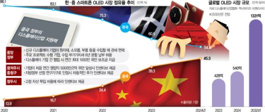 중국 업체들의 빠른 추격이 가능했던 것은 디스플레이 공장 건설부터 가동, 인재 육성까지 전 단계에 걸친 정부의 전폭적인 지원책 영향이 크다. 중국 정부는 공장 설립 시 필요한 토지를 무상 대여하고 제조 장비를 기업이 구매할 때도 보조금을 50% 이상 지원하고 있다. 생산 단계에서는 목표 수율을 달성하면 격려금을, 적자가 나면 보조금을 주는 방식으로 지원한다. 과감한 투자 및 물량 공세로 LCD 세계시장 1위를 차지한 경험을 교본 삼아 OLED에도 막대한 자원을 쏟아붓고 있는 것이다.