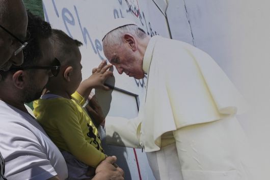 지난 4월 25일 요르단 서안지구 베들레헴에 있는 이스라엘의 분리 장벽 근처에서 한 소년이 현수막에 인쇄된 프란치스코 교황의 사진을 만지고 있다. [사진 | 뉴시스] |
