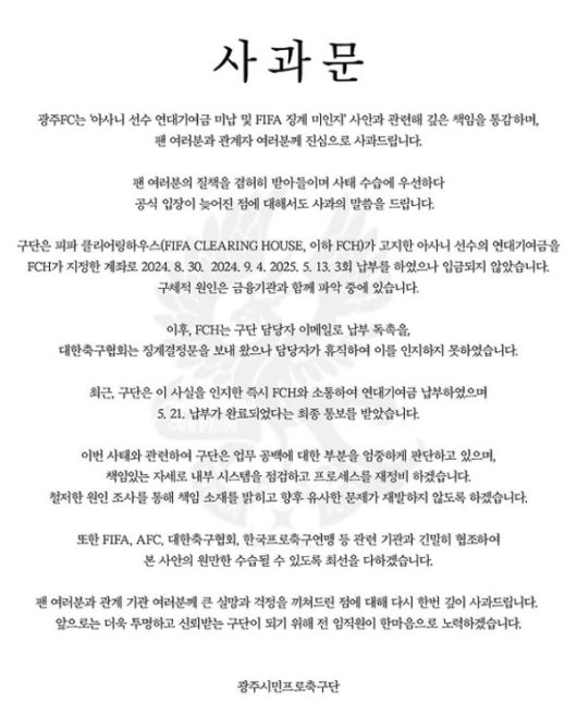 광주는 21일 구단 공식 SNS를 통해 ''아사니 선수 연대기여금 미납 및 FIFA 징계 미인지' 사안과 관련해 깊은 책임을 통감하며, 팬 여러분과 관계자 여러분께 진심으로 사과드린다. 팬 여러분의 질책을 겸허히 받아들이며, 사태 수습에 우선하다 공식 입장이 늦어진 점에 대해서도 사과의 말씀을 드린다'라고 거듭 고개를 숙였다.