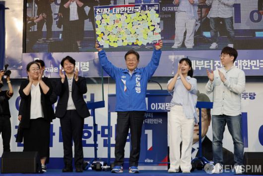 [인천=뉴스핌] 김학선 기자 = 이재명 더불어민주당 대선후보가 21일 인천 계양구 계양역 앞 광장에서 열린 유세에서 시민들이 작성한 소망 쪽지가 붙은 액자를 들고 기념촬영을 하고 있다. 2025.05.21 yooksa@newspim.com